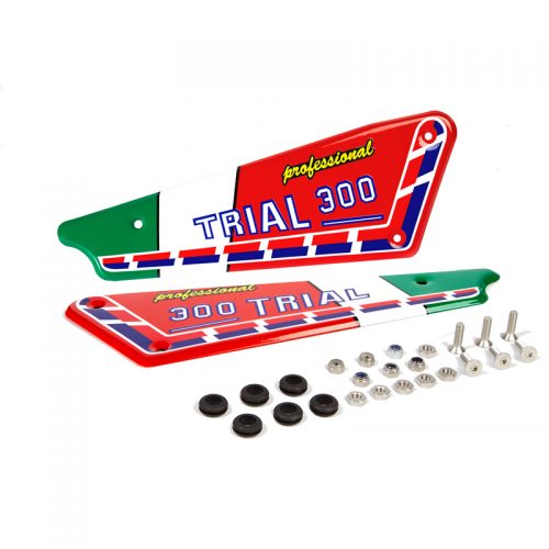 Placas laterales de aluminio con adhesivos barnizadas italianas para Fantic 300. De diseño propio y exclusivo de DelayTrial con bandera italiana. Las placas están plastificadas, pintadas y barnizadas dando mayor durabilidad a los adhesivos.
